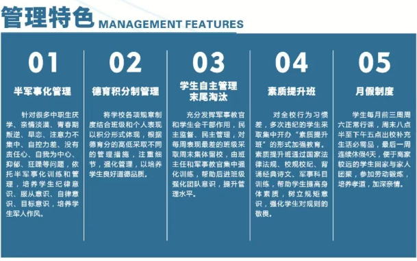 通过全封闭、半军事化管理,推行德育分制和学生自主管理,帮助中考成绩不佳的学生实现人生逆袭,获得大学录取通知书,迈向理想大学和幸福未来。